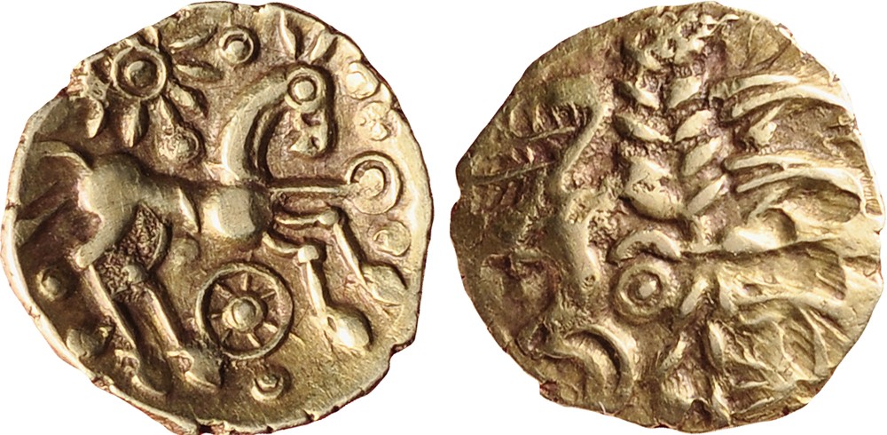 Britain. First century BC. B-type British Remic. Quart stater gold, 1,29 gr. Obv. Portrait Apollo to the right, rev. Celtic horse to the right. Ex. Karel de Geus 20/1112. A.XF.