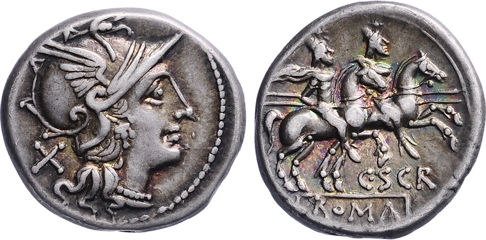 Roman Republic. Ca. 154 BC. Denarius. C. Scribonius. A.XF.