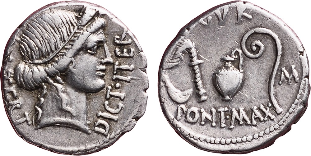 Roman Republic. 44 BC. Denarius. Julius Ceasar, uncertain mint early 46 BC (Utica). VF+. Ex. MPO May 2013/214.