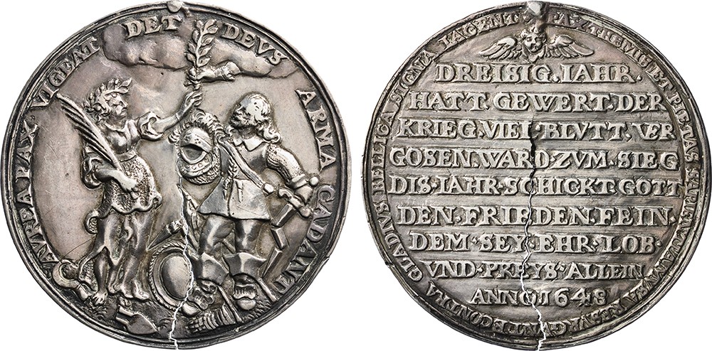 Germany. Medal 1648. Peace of Westphalia. Silver 54mm, 20,38 g. Fine details. Damaged.