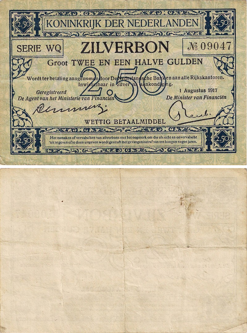 2 1/2 Gulden 1915 zilverbon. 1 Augustus 1917. Almanak 11-3a. Bijna zeer fraai.
