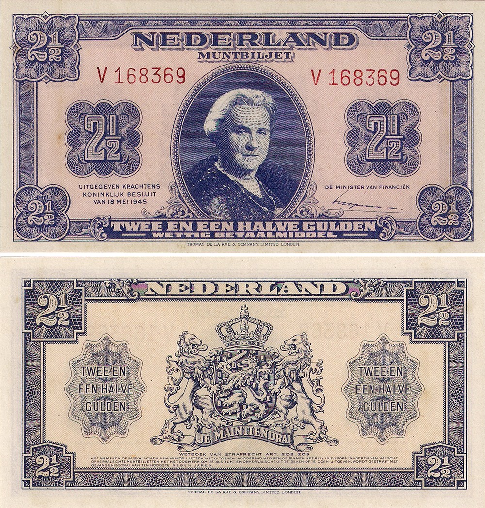 2 1/2 Gulden 1945 muntbiljet. Almanak 15-1a. UNC-.