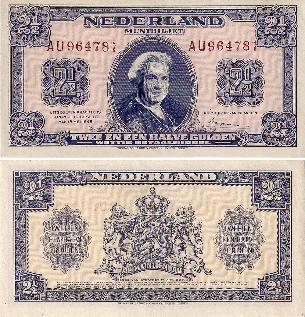 2 1/2 Gulden 1945 muntbiljet. Almanak 15-1b. Prachtig.