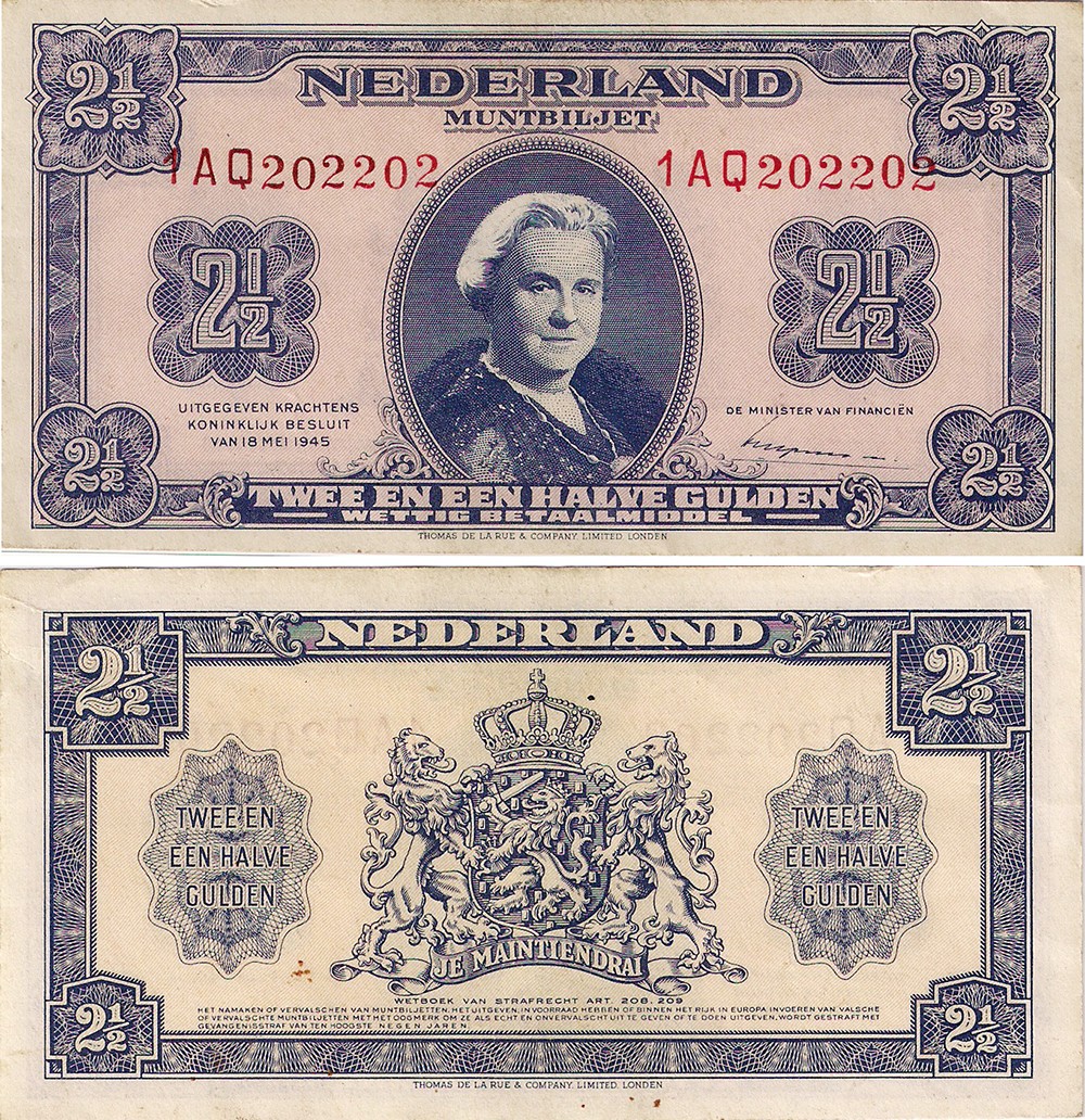 2 1/2 Gulden 1945 muntbiljet. Almanak 15-1c. Prachtig.
