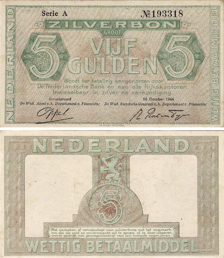 5 Gulden 1944 zilverbon. Almanak 22-1a. Prachtig/UNC.