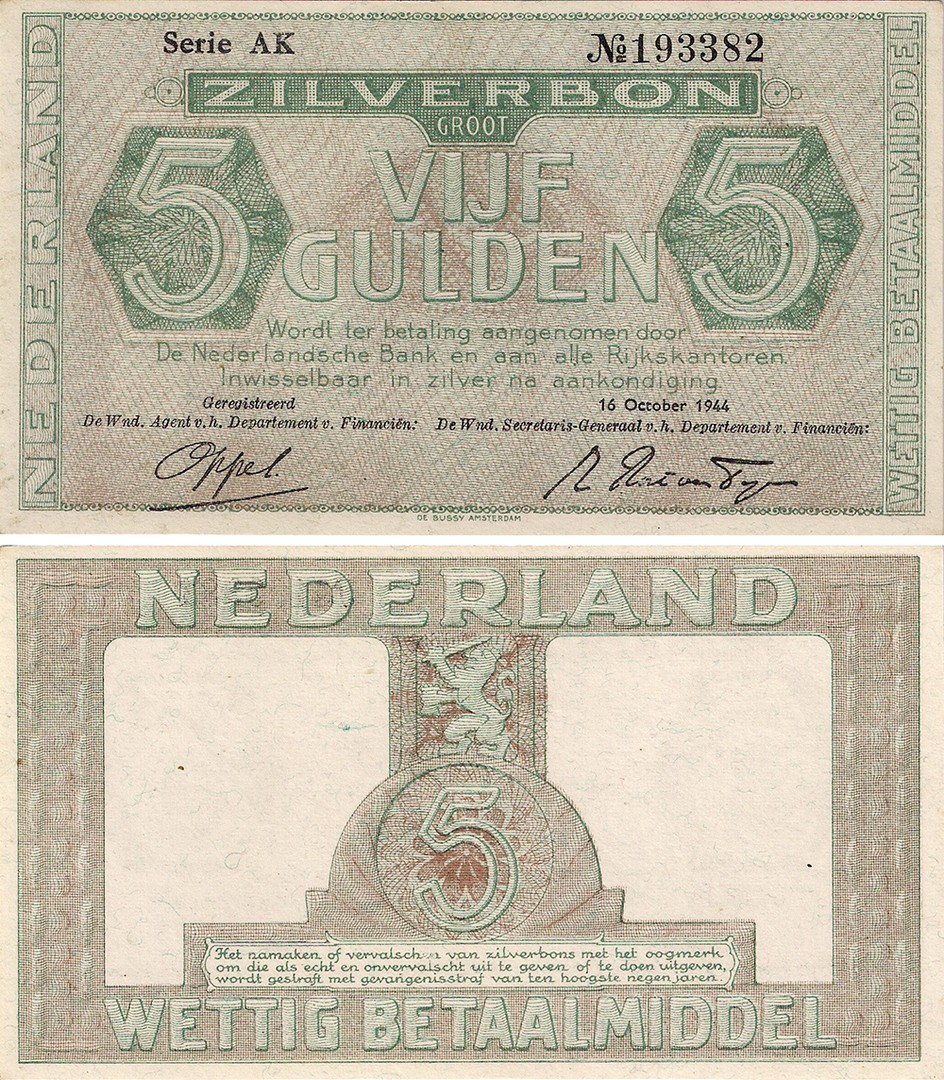 5 Gulden 1944 zilverbon. Almanak 22-1b. UNC.