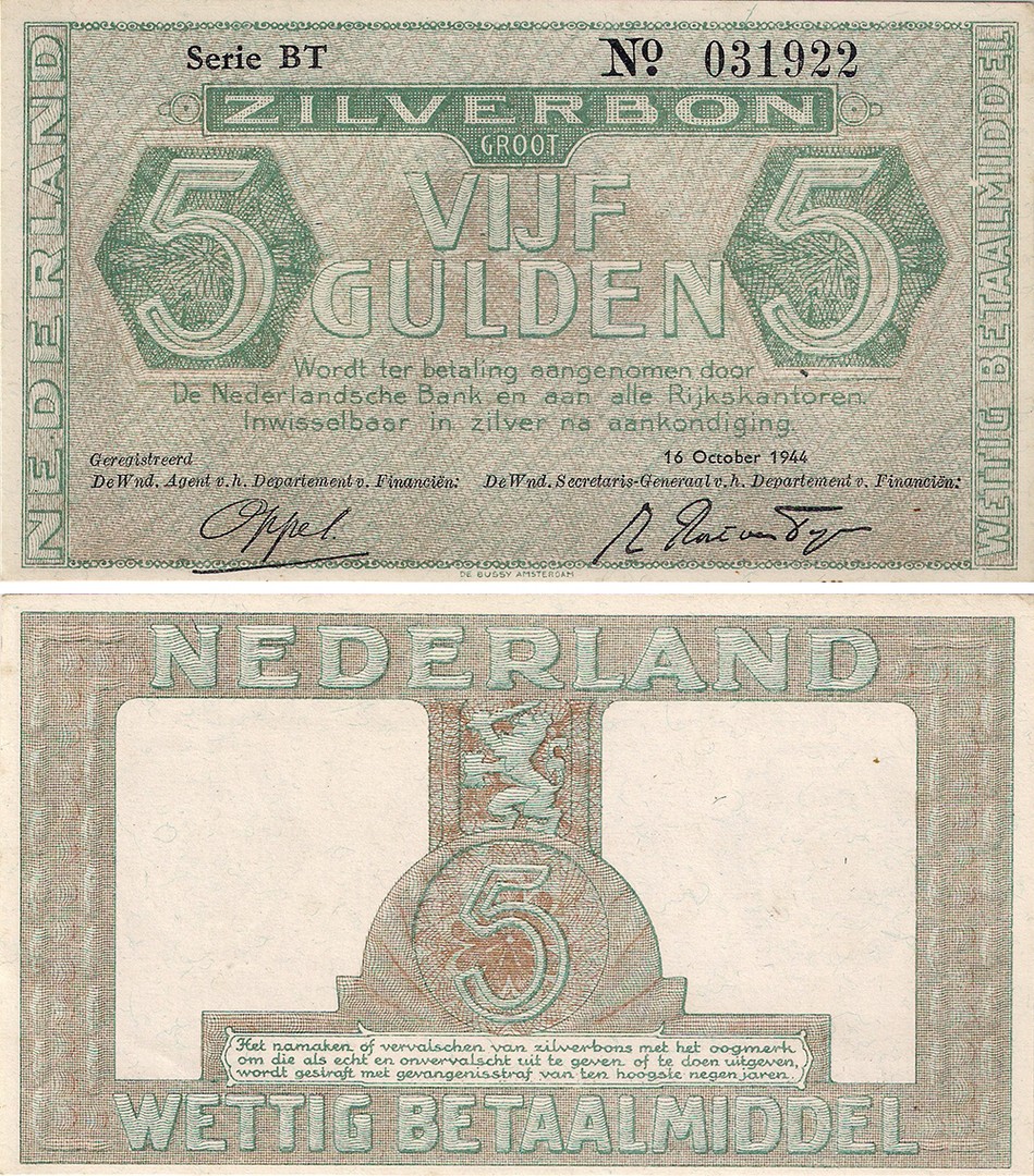 5 Gulden 1944 zilverbon. Almanak 22-1c. UNC.