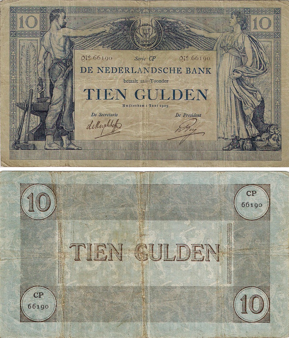 10 Gulden 1904 muntbiljet. 1 juni 1909. Almanak 36-1b. Speldenprikje in centrum, overigens nette kwaliteit. Fraai/zeer fraai.
