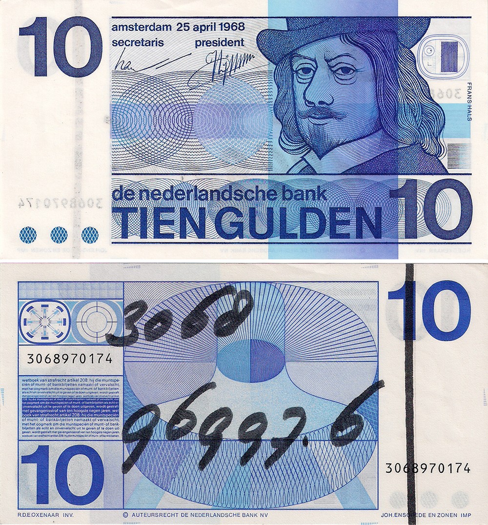 10 Gulden 1968 bankbiljet. Almanak 49-1a. Afgekeurd biljet met afkeurstreep en nummer DNB. Interessant!