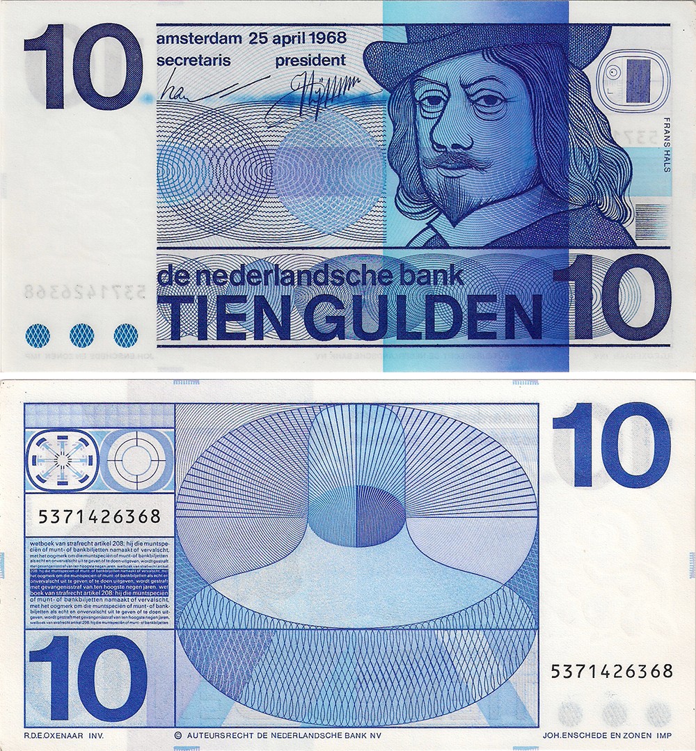 10 Gulden 1968 bankbiljet. Almanak 49-1a. MISDRUK met blauwe uitloopstreep. Interessant!