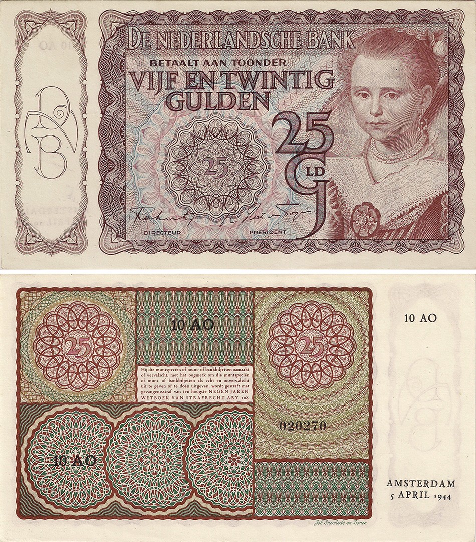 25 Gulden 1943-I bankbiljet. Almanak 78-1b. UNC.