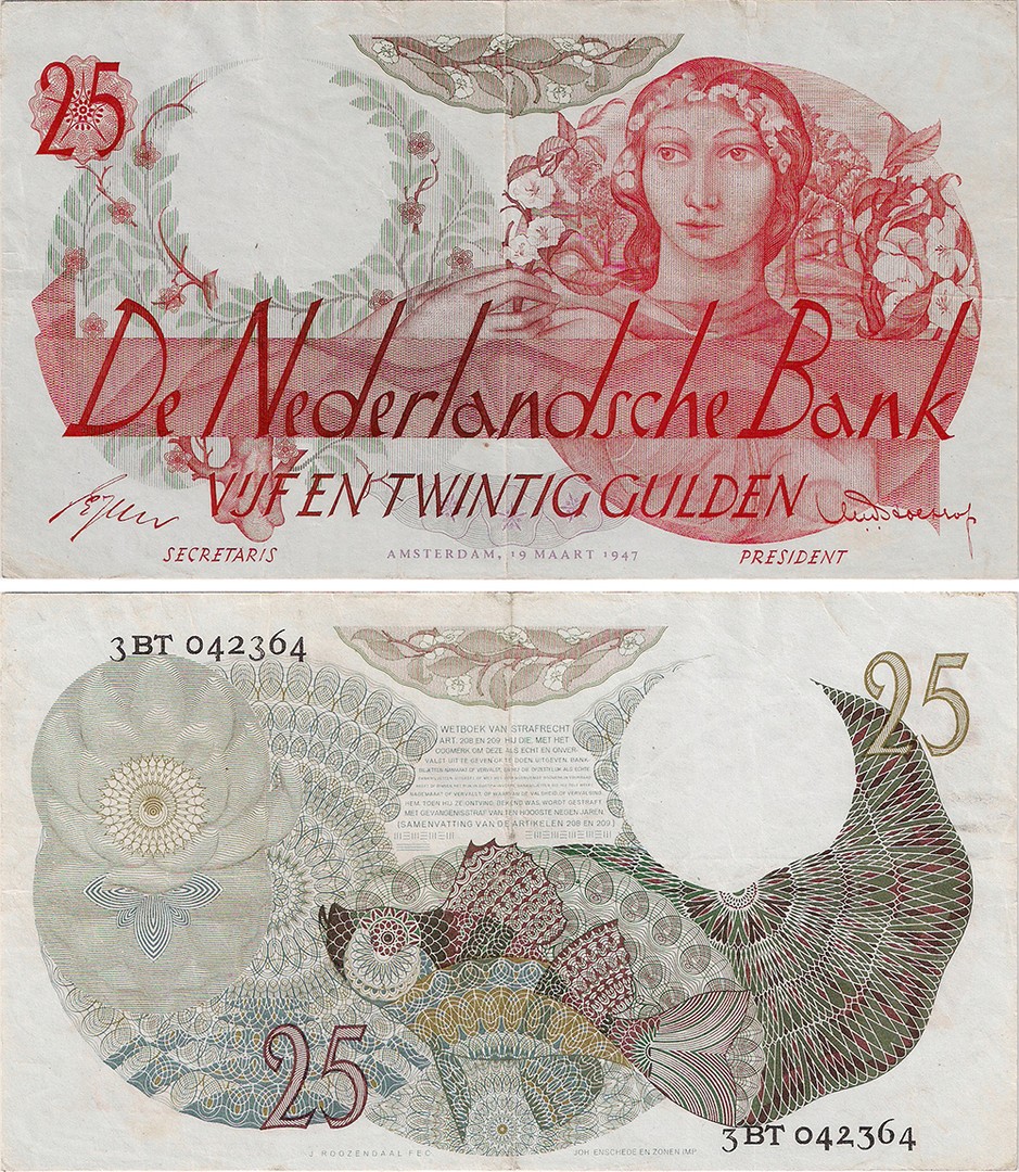 25 Gulden 1947 bankbiljet. Almanak 81-1. Zeer fraai+.