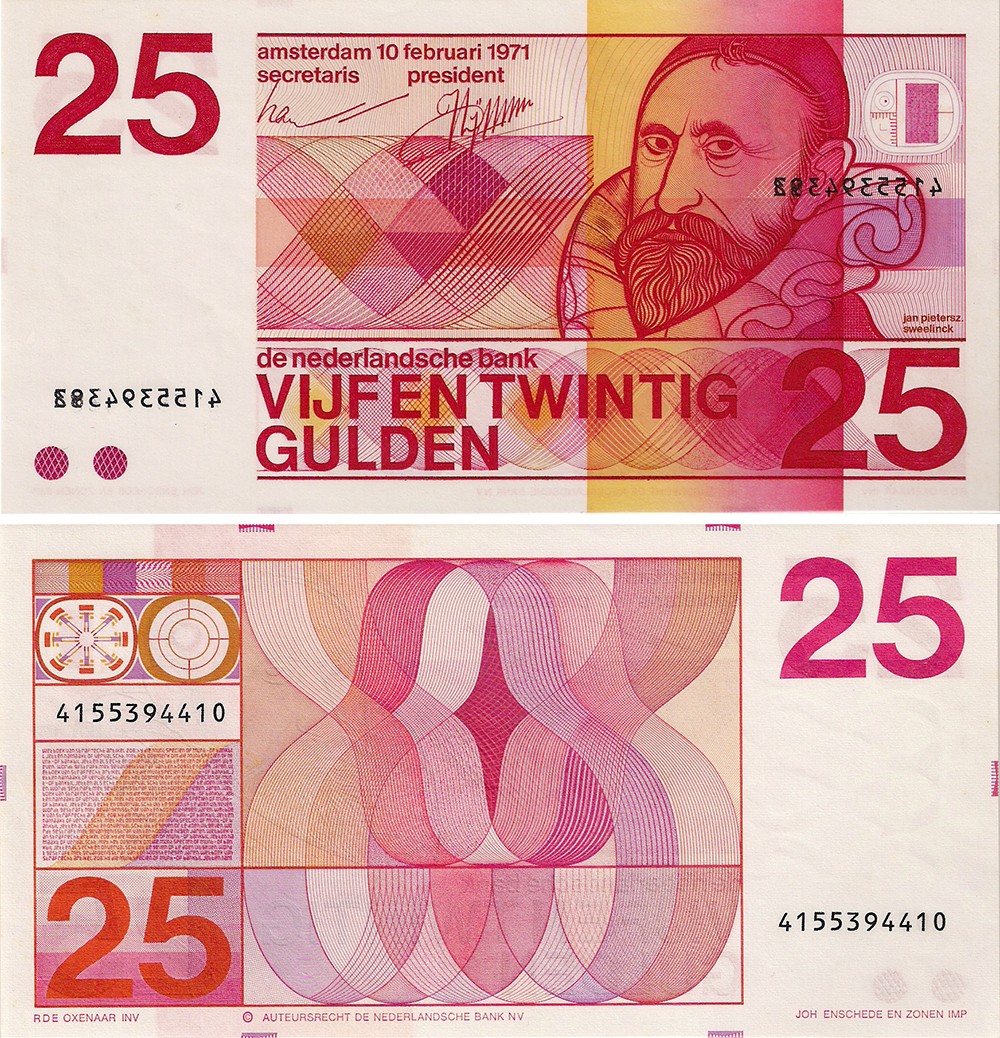 25 Gulden 1971 bankbiljet. Almanak 84-1. Serie 4155. UNC. MISDRUK met serienummer in spiegelschrift op voorzijde