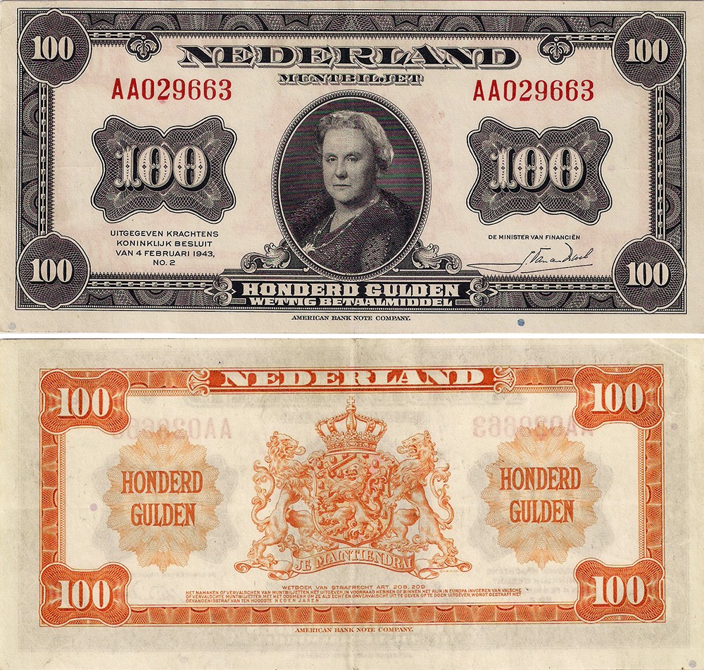 100 Gulden 1943 muntbiljet. Almanak 118-1. Ca. prachtig.