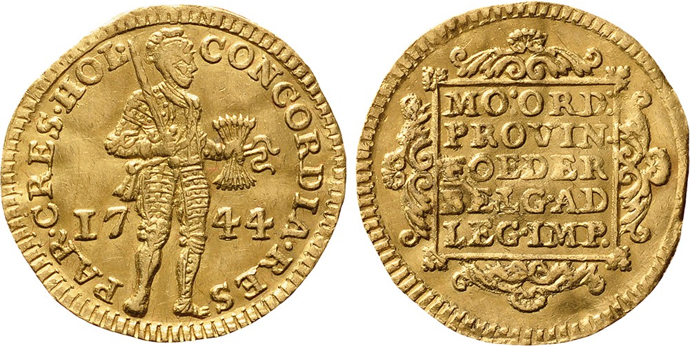 Gouden dukaat 1744/ over ouder jaar 1714(?). Cnm 2.28.54; D.775. Zeer fraai+.