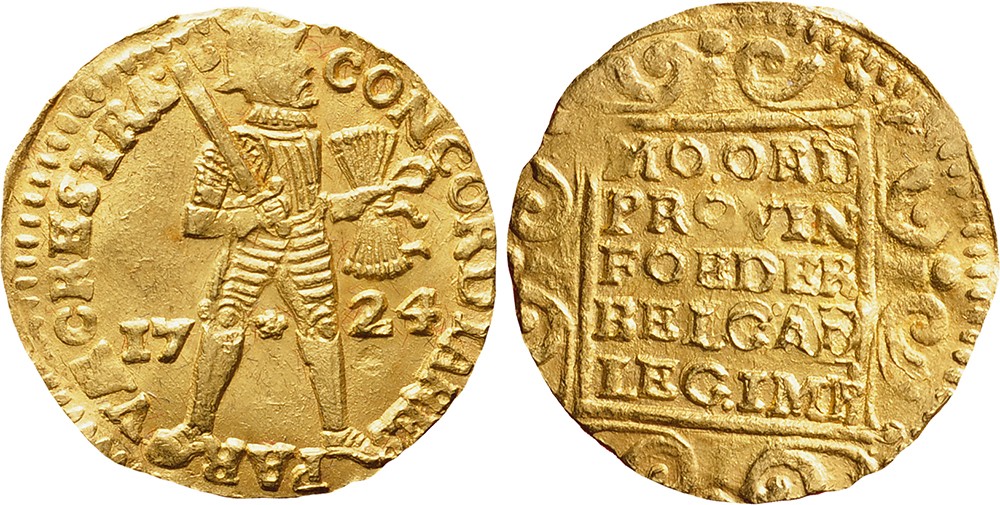 Gouden dukaat 1724. Cnm. 2.43.45; D.965. Zeer fraai/prachtig. Uit VOC-schip De Akerendam.