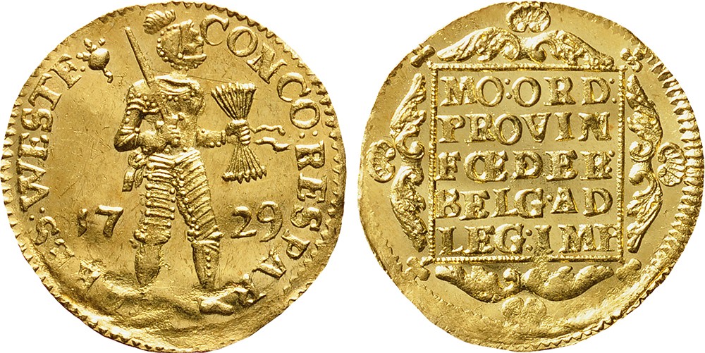 Gouden dukaat 1729. Cnm. 2.46.16; D.838. FDC. Uit VOC-schip 't Vliegent Hart. Ex. AA Muntenveiling 43/91.