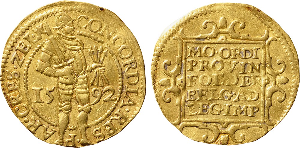 Gouden dukaat 1592. Cnm. 2.49.25; D.883. Zeer fraai. Ex. Laurens Schulman 11/236.