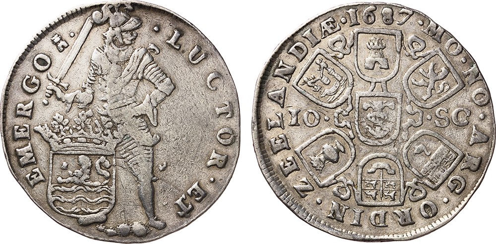 Dubbele daalder van 10 schelling 1687. Cnm. 2.49.67; D.1074. Zeer fraai.