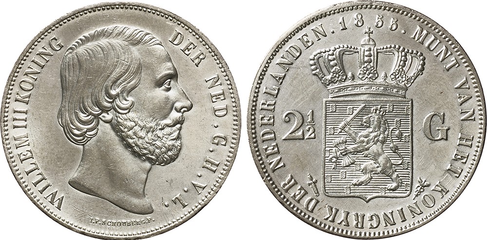 2 1/2 Gulden 1855. FDC. Zeldzaam in deze mooie kwaliteit!