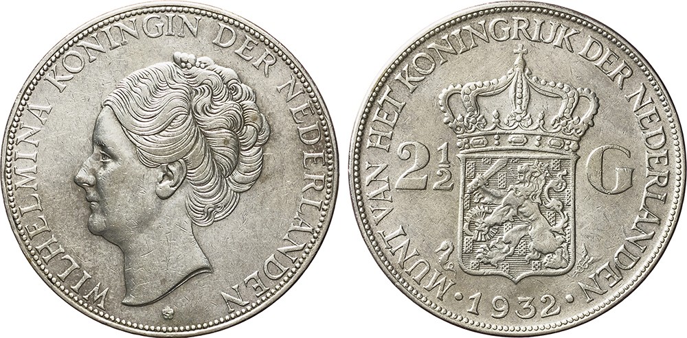 2 1/2 Gulden 1932b. Grof haar. Zeer fraai.