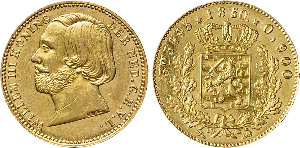 5 Gulden goud 1850. Sch.547. Zeldzaam, oplage enkele proefstukken. FDC.