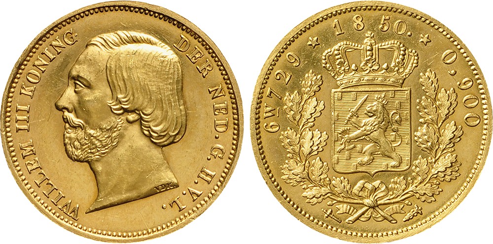 10 Gulden goud 1850. Sch.545. Zeldzaam, oplage slechts enkele proefstukken. Met gepolijste stempels geslagen. PROOF. FDC.