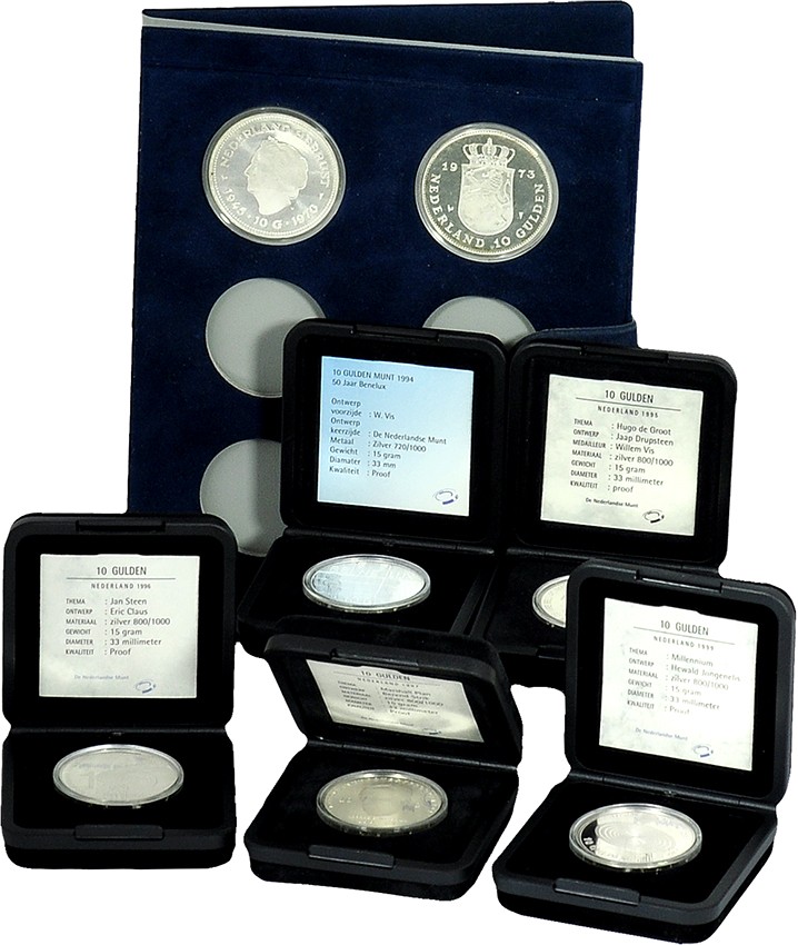 10 Gulden 1970 prooflike en 1973, 94, 95, 96, 97, 99 proof. 7 ex.