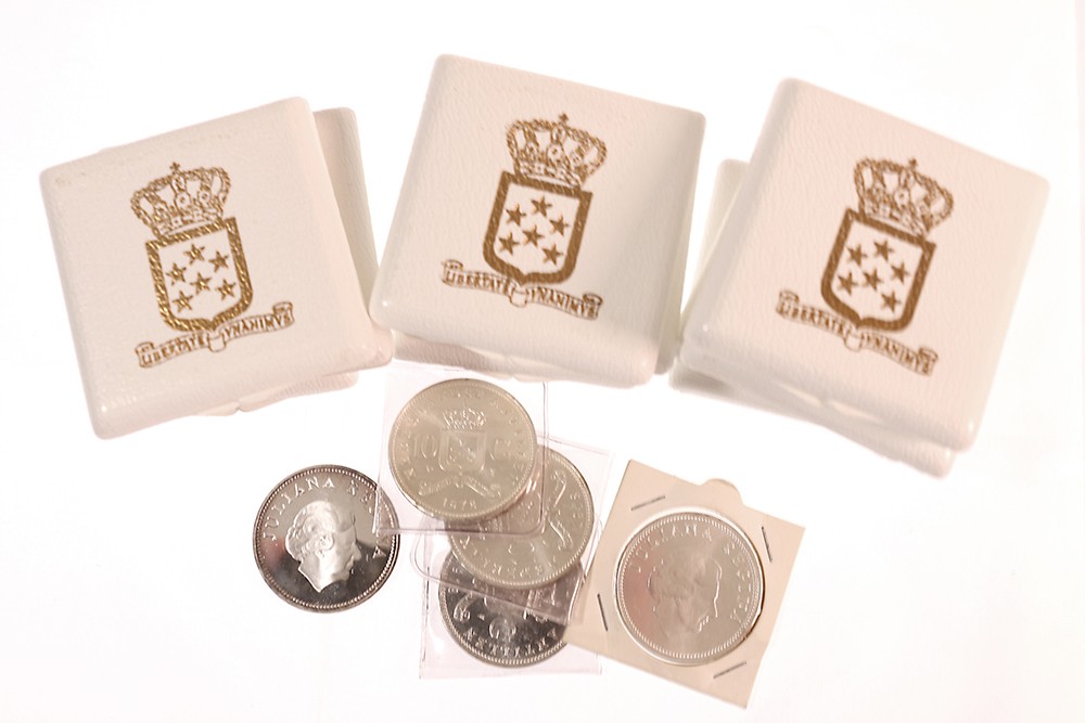 Ned. Antillen. 10 Gulden zilver 1978 UNC(4), Prooflike(13). 17 ex.