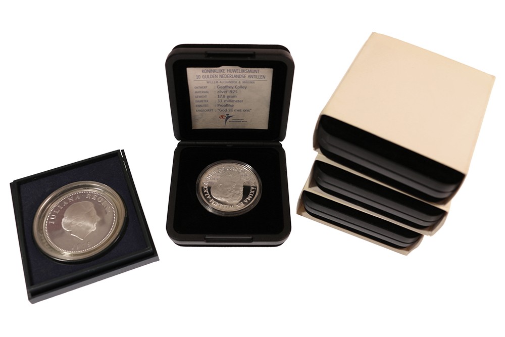 Ned. Antillen. 10 gulden zilver 2002(4) en 25 gulden zilver 1979. 5 ex.
