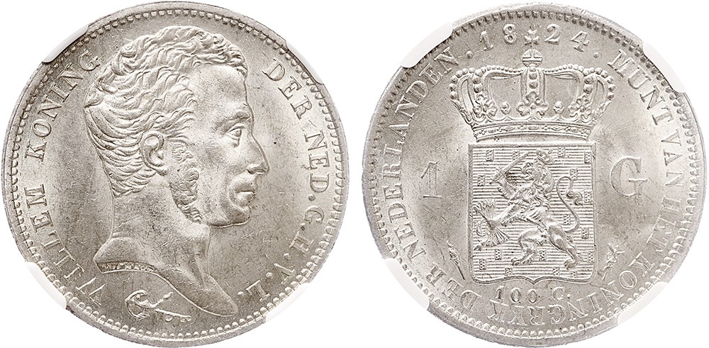 1 Gulden 1824 Utrecht. FDC. NGC MS 64. Zeldzaam mooie kwaliteit!