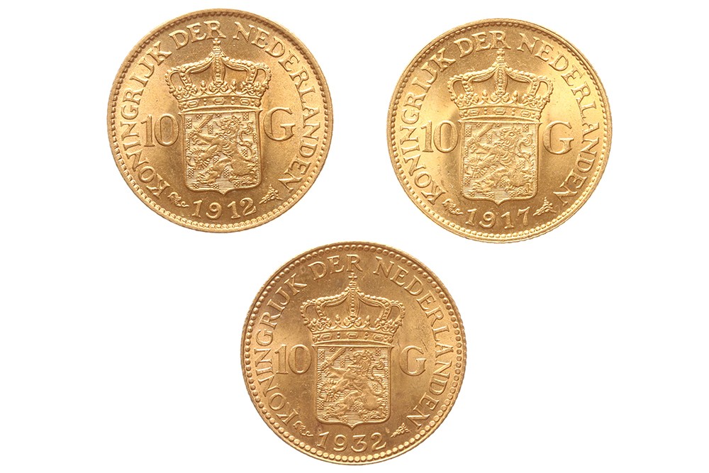 10 Gulden goud 1912, 17, 32. Prachtig. 3 ex.