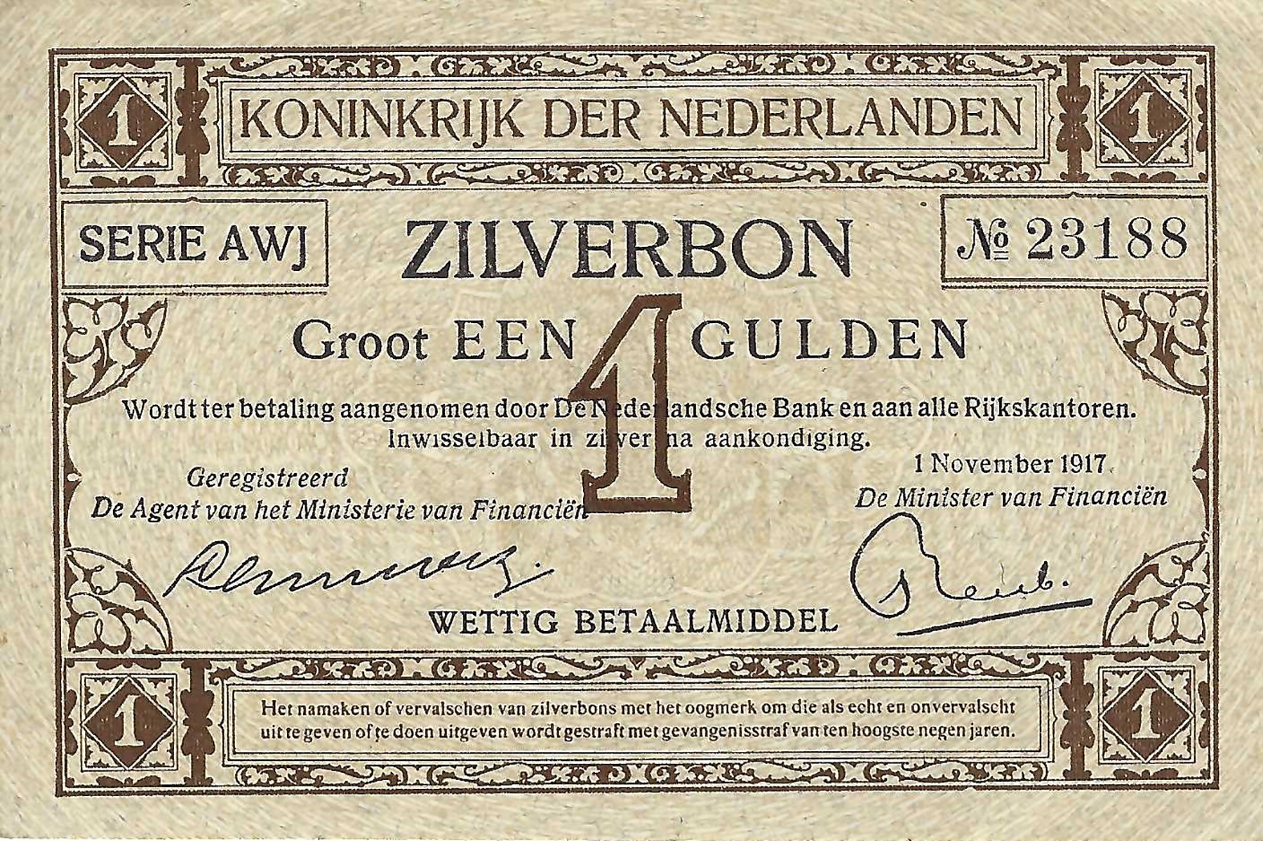 Netherlands. 1 Gulden 1916 zilverbon. Alm. 02-2b. UNC.