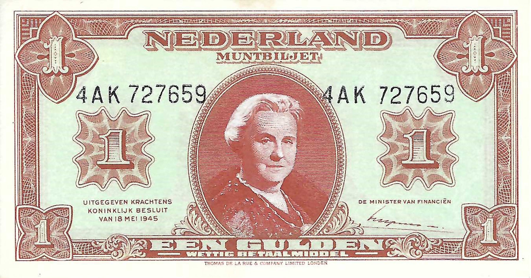 Netherlands. 1 Gulden 1945 muntbiljet. Alm. 06-1c. UNC.