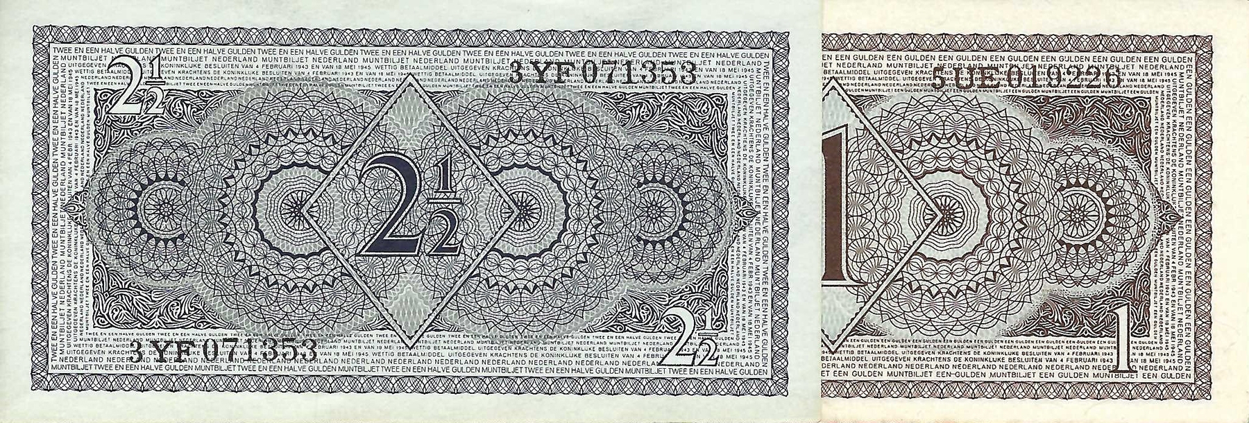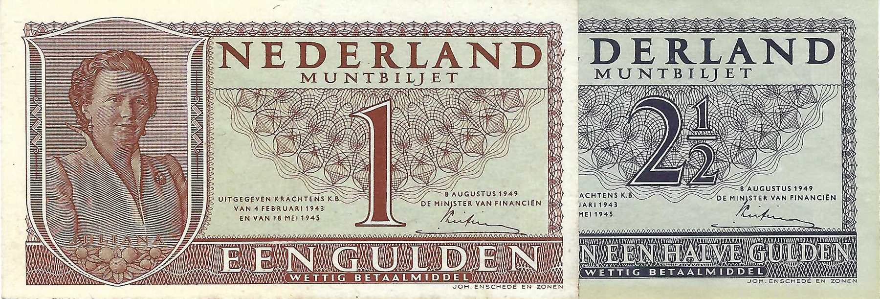 Netherlands. 1 Gulden en 2 1/2 gulden 1949 muntbiljet. Alm. 07-1a en 16-1b. UNC. 2 ex.
