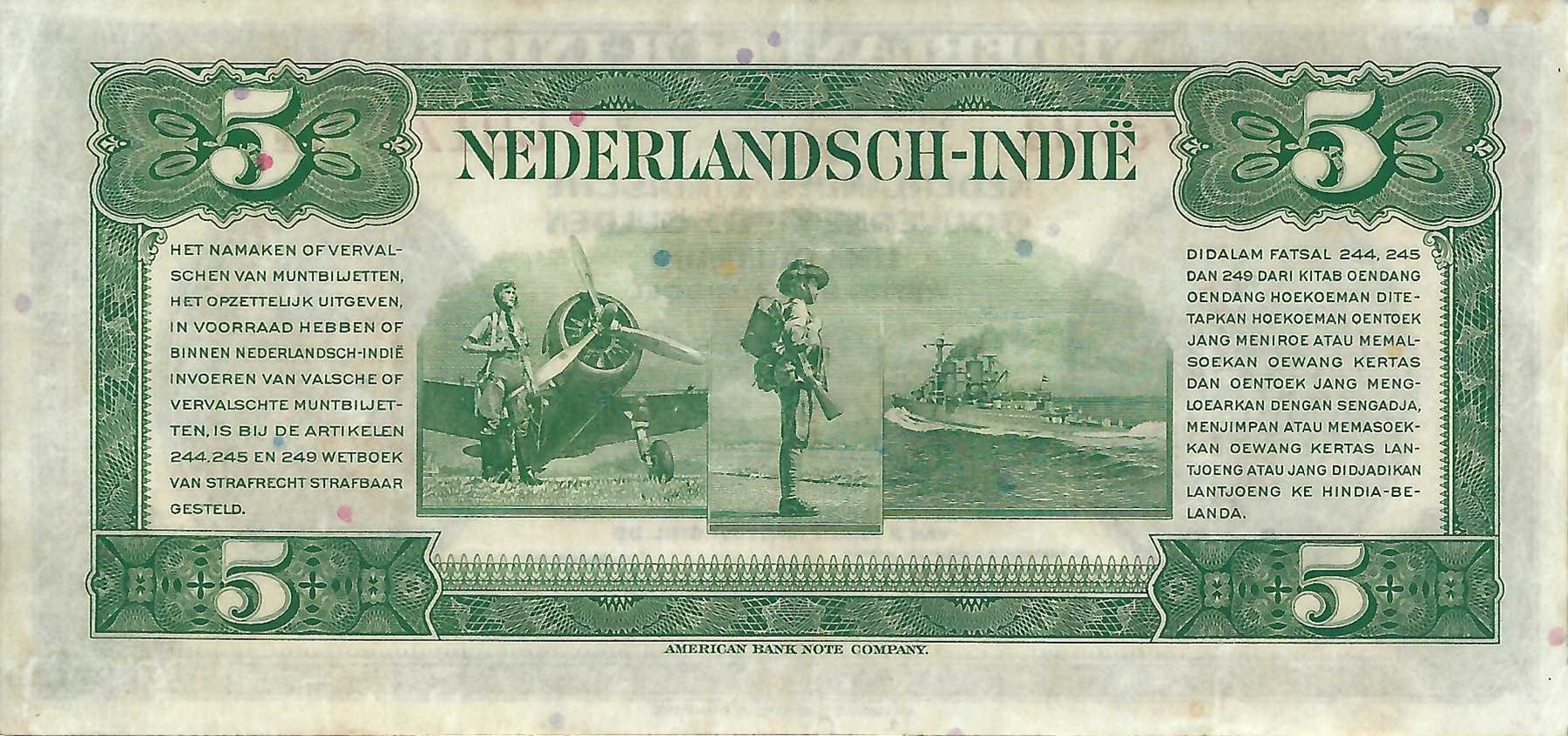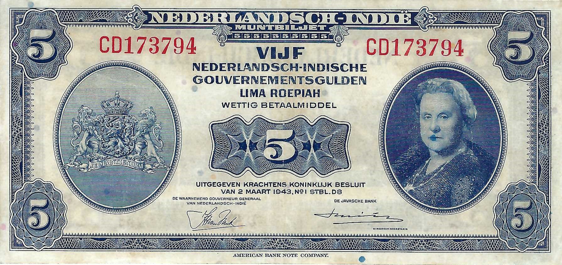 Nederlands Indië. 5 gulden 1943. Prachtig.