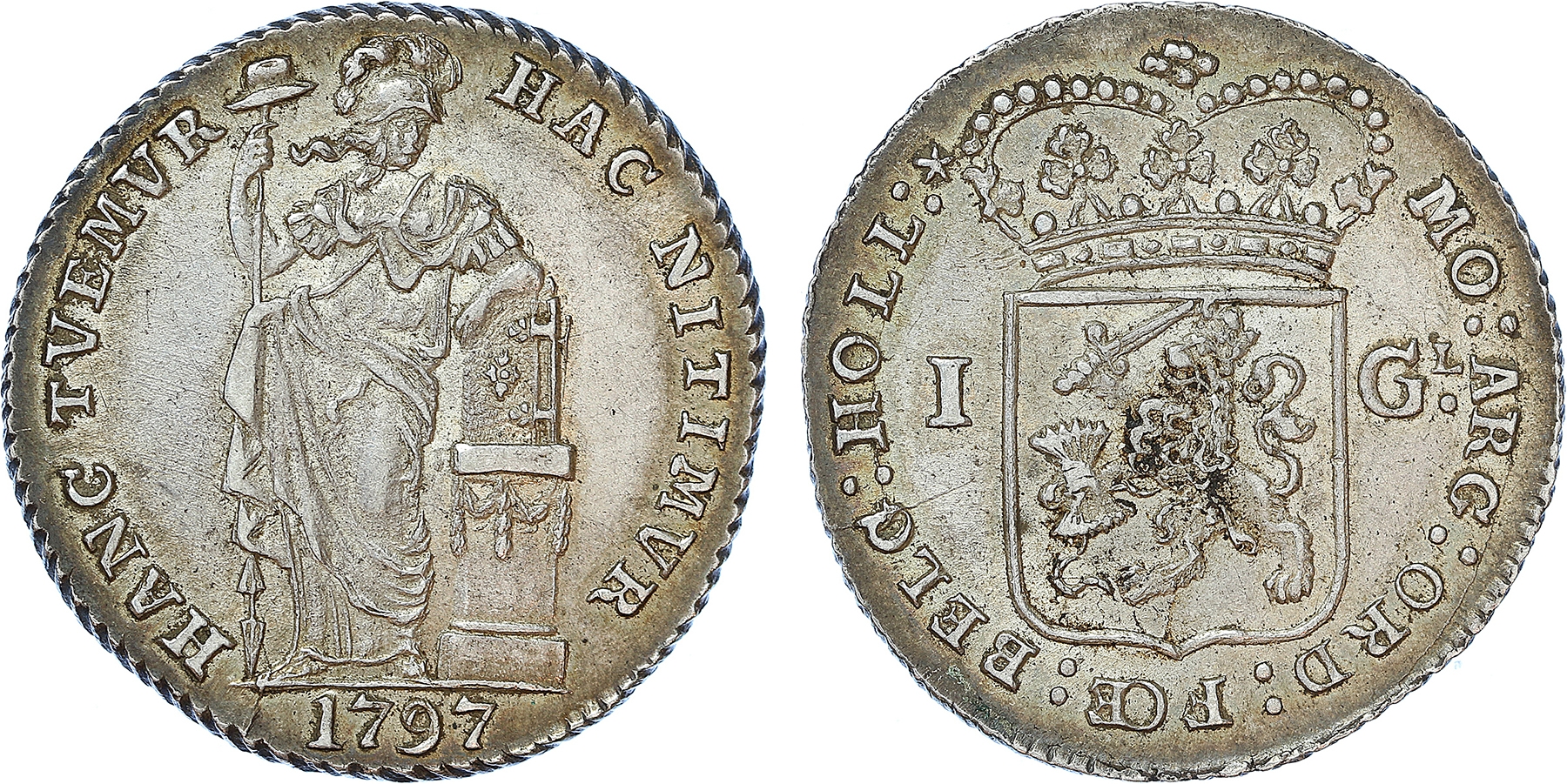 Netherlands. Bataafse Republiek. Holland. 1 Gulden 1797 over ouder jaar, vermoedelijk een 8 of een 0 onder de 9. Sch.92 var. Onbekende en interessante jaartalwijziging. Mooie donkere patina. FDC.