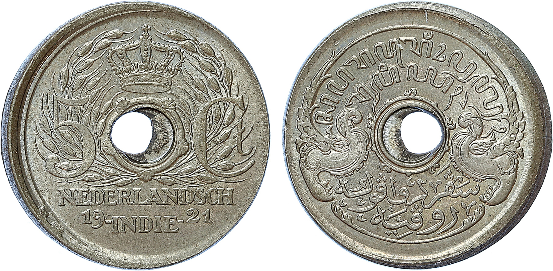 Nederlands Indië. 5 Cent 1921. Scho.858. Misslag. Decentrisch geslagen met een te kleine centrale doorboring. Interessant! FDC.
