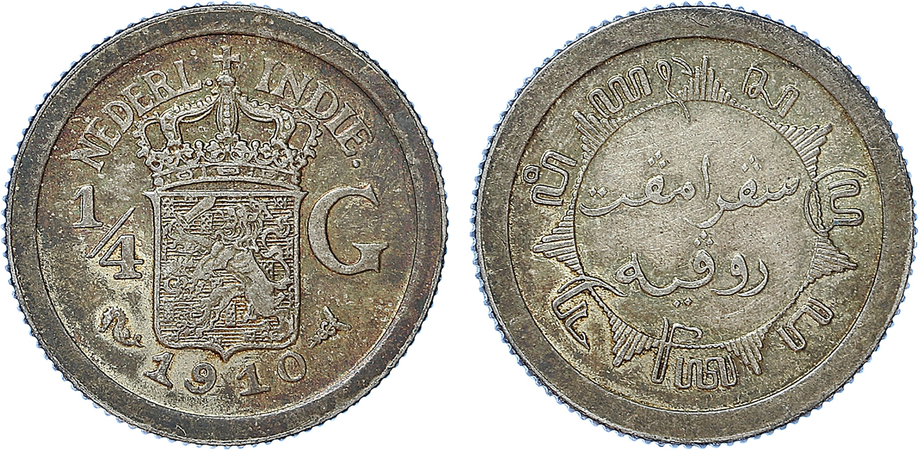 Nederlands Indië. 1/4 Gulden 1910. Mogelijk met gepolijste stempels geslagen. UNC.