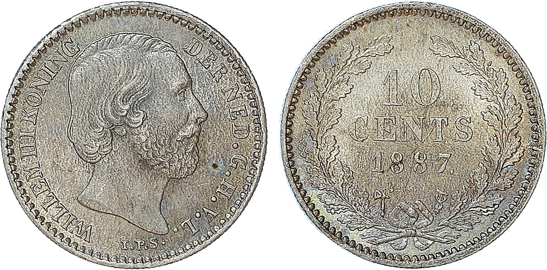 Netherlands. 10 Cent 1887. Mooie patina. FDC.