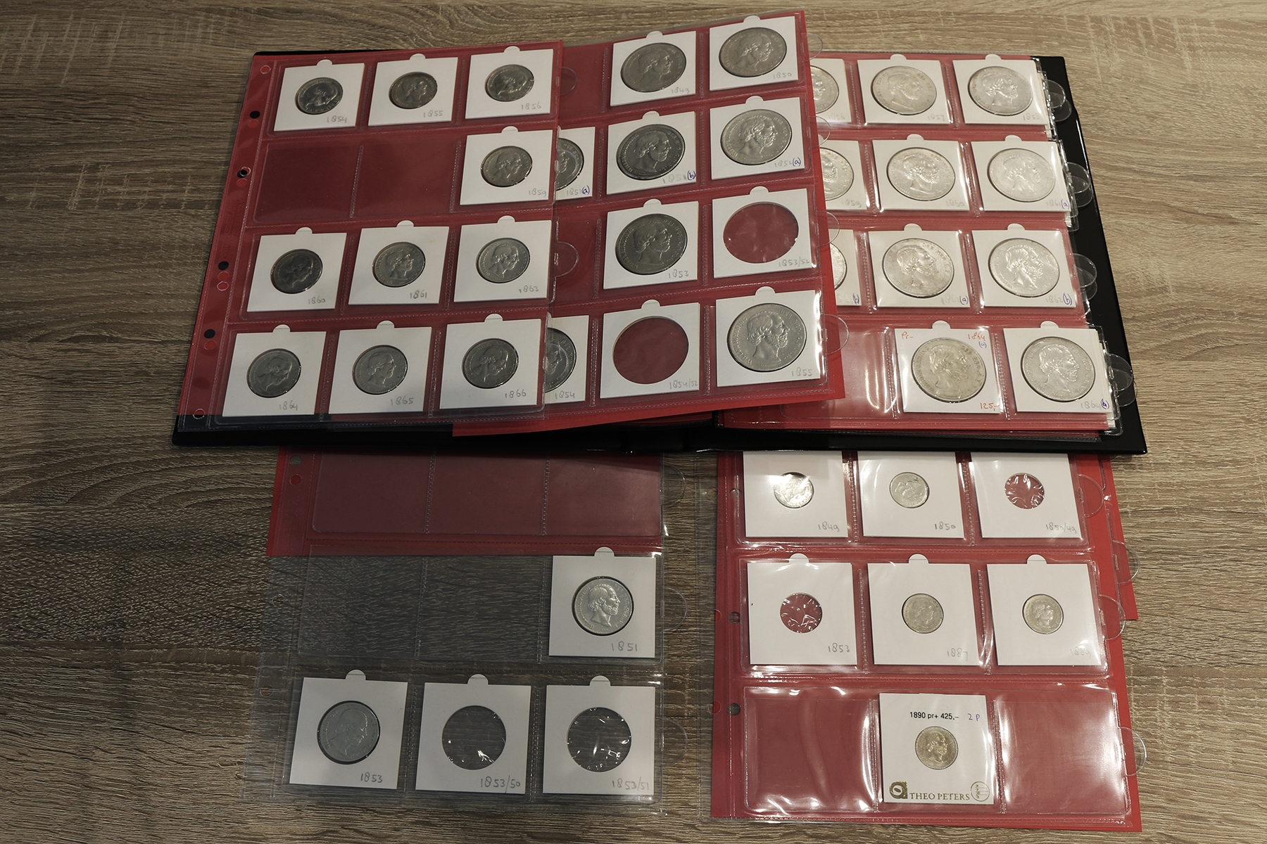 Willem III. Collectie in album, 25 cent t/m 2 1/2 gulden, op jaartal verzameld. Diverse betere jaren en kwaliteiten. Moet gezien worden.