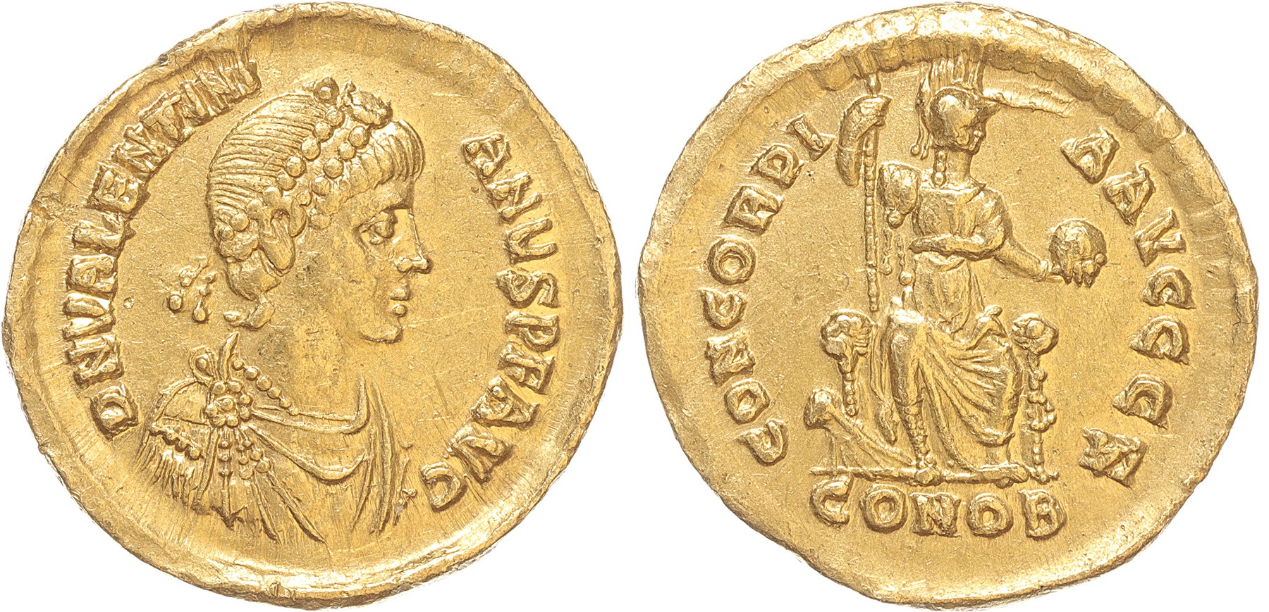 Valentinianus II (AD 375-392) - AV Solidus (Constantinopolis, 4,44g). RIC 67a. RR - XF. Ex. Grün A 47/1661