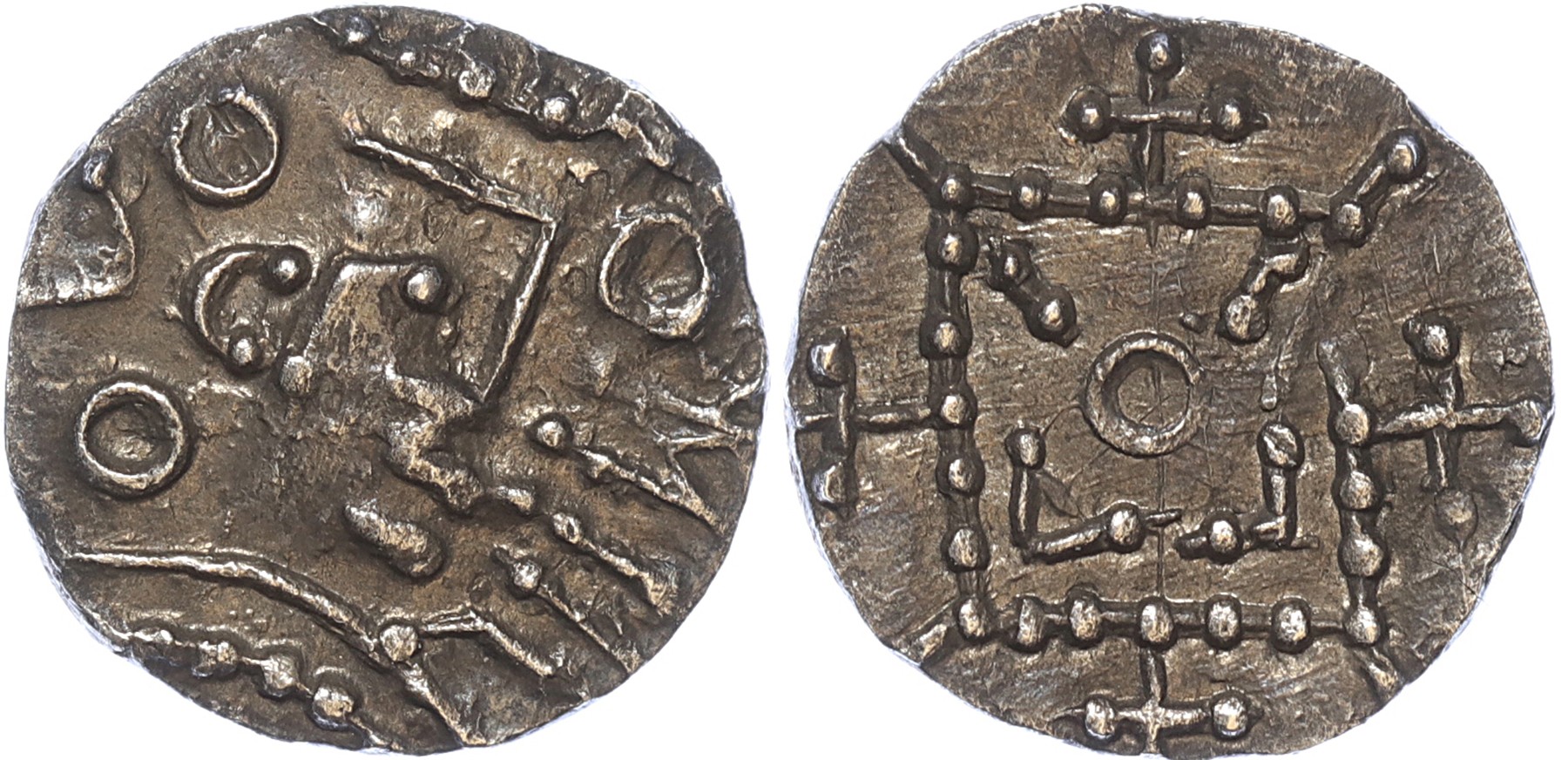 Friese gebieden. AR Sceatta portret naar rechts omgeven door cirkels en runenschrift. RR. Prachtig. Ex. Henzen L 175/1060