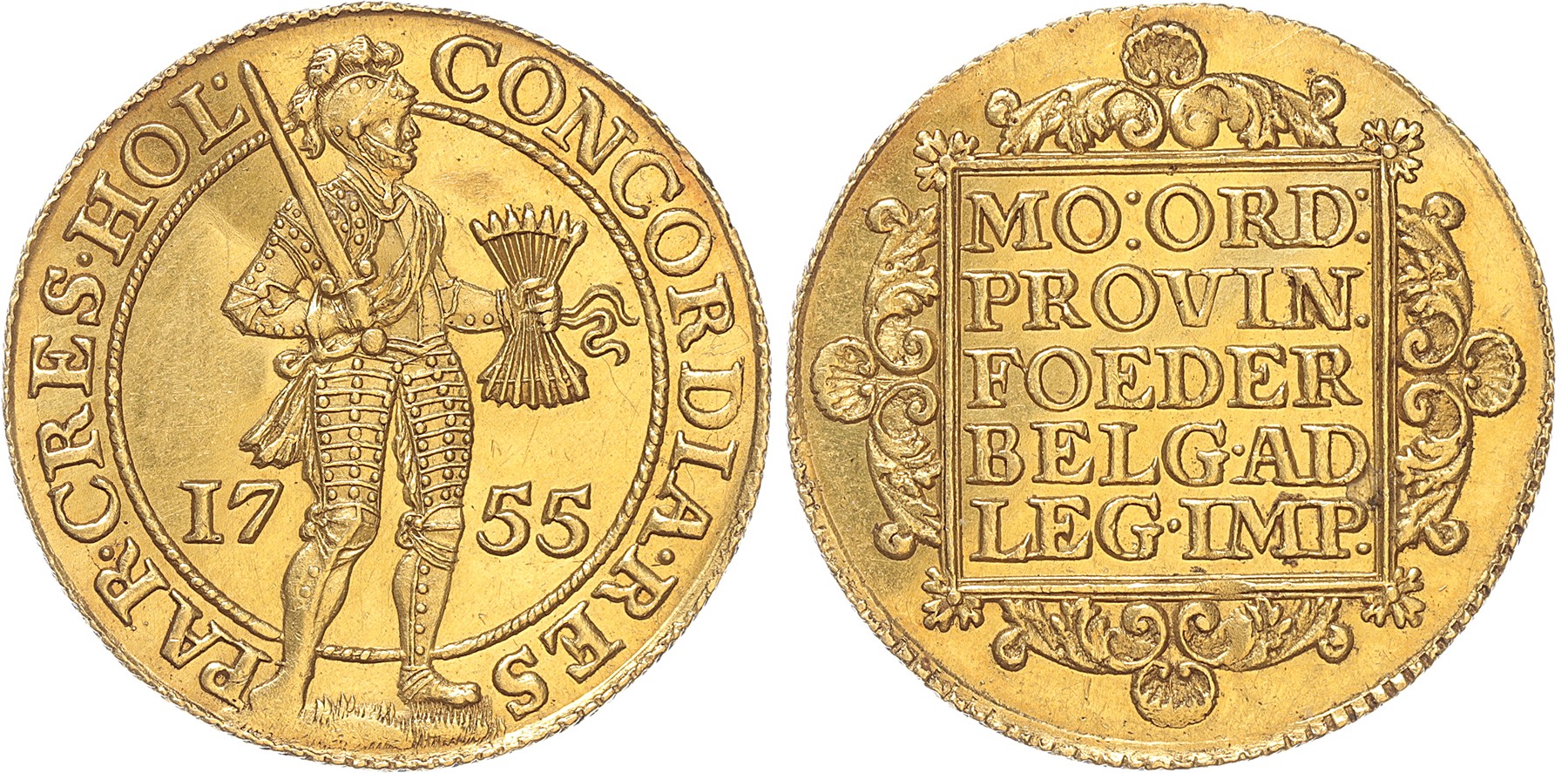 Holland. Dubbele Nederlandse dukaat goud 1755. Cnm 2.28.52; D.773. Lichte vouw in muntplaatje, overigens prachtig.