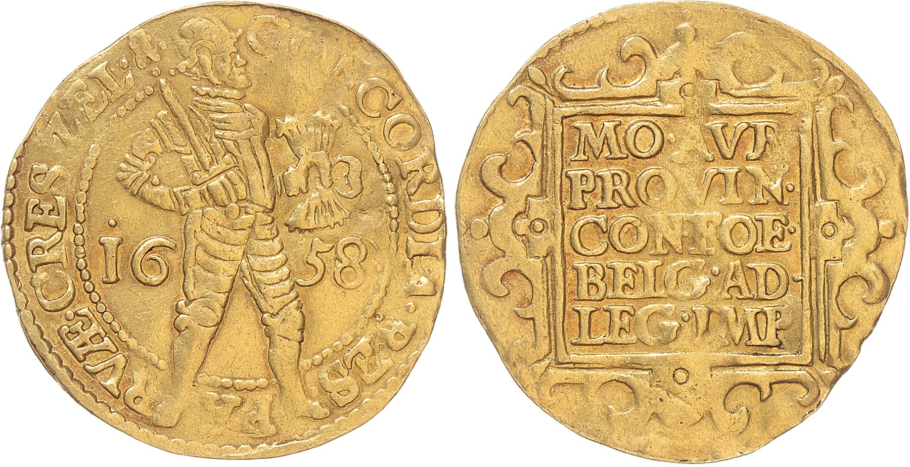 Zeeland. Dubbele Nederlandse dukaat goud 1658/56. Cnm 2.49.23; D. 881; V. 78.3. RRR. Zeer fraai. Ex. Henzen L 176/953