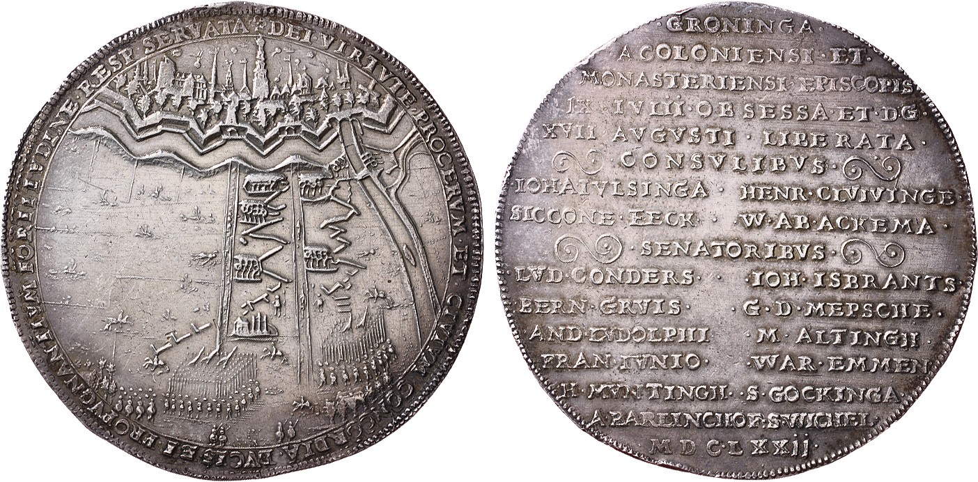1672. Ontzet van Groningen. Vz. Gezicht op de stad waarop bommen vallen. Kz. Tekst en jaartal op 16 regels. Zilver 58 mm, 63,48 g. Zeer fraai+.