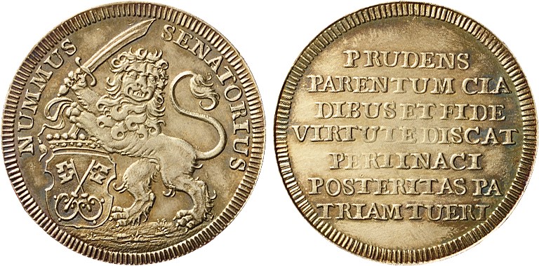 Z.J. (ca. 18e eeuw). Vroedschapspenning Leiden. Vz. Klimmende leeuw met zwaard en stadswapen. Kz. Zevenregelige Latijnse tekst. Zilver 32 mm, 8,2 g. Zeer fraai+.