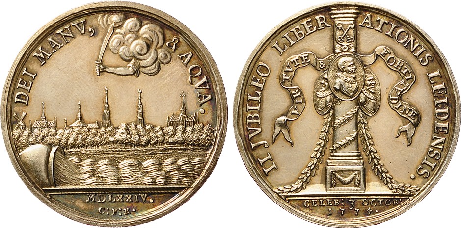 1774. Tweede eeuwfeest van het ontzet van Leiden. Vz: Gezicht op de stad Leiden aan water, dat uit waterkruik stroomt. Kz: Zuil met wapenschild en wimpel met opschrift. In de afsnede de datering: 3 oct. 1774. Zilver 39 mm, 17,49 g. Zeer fraai+.