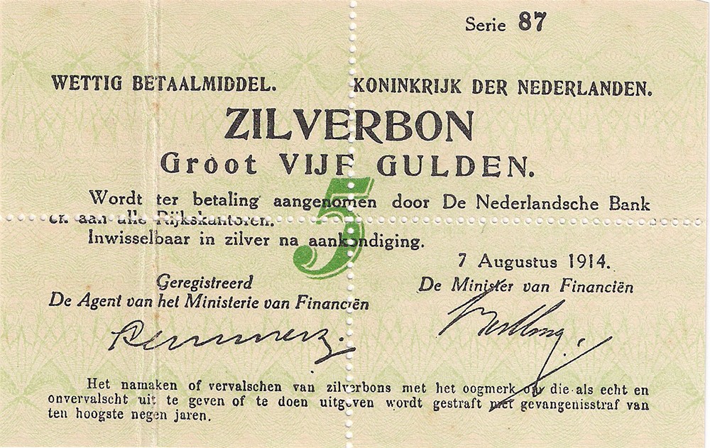 5 Gulden zilverbon 1914. Geperforeerd. UNC.