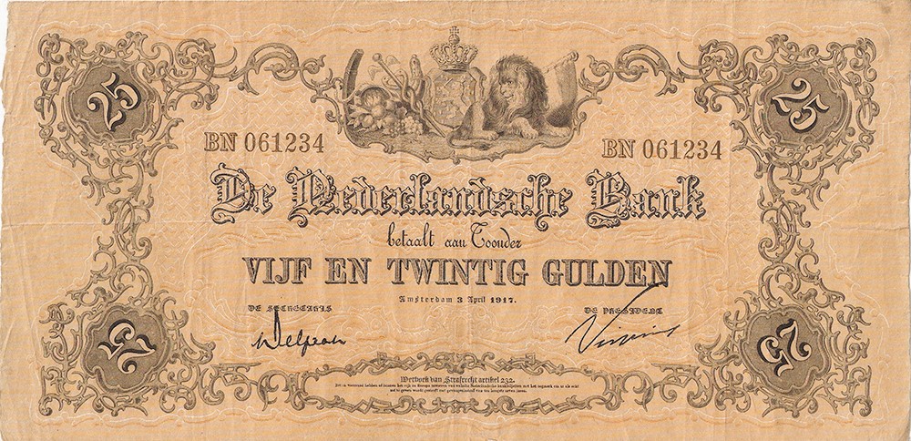 25 Gulden 1860 bankbiljet. 3 april 1917. Alm. 71-10. Mooi fris biljet. Ruim zeer fraai.